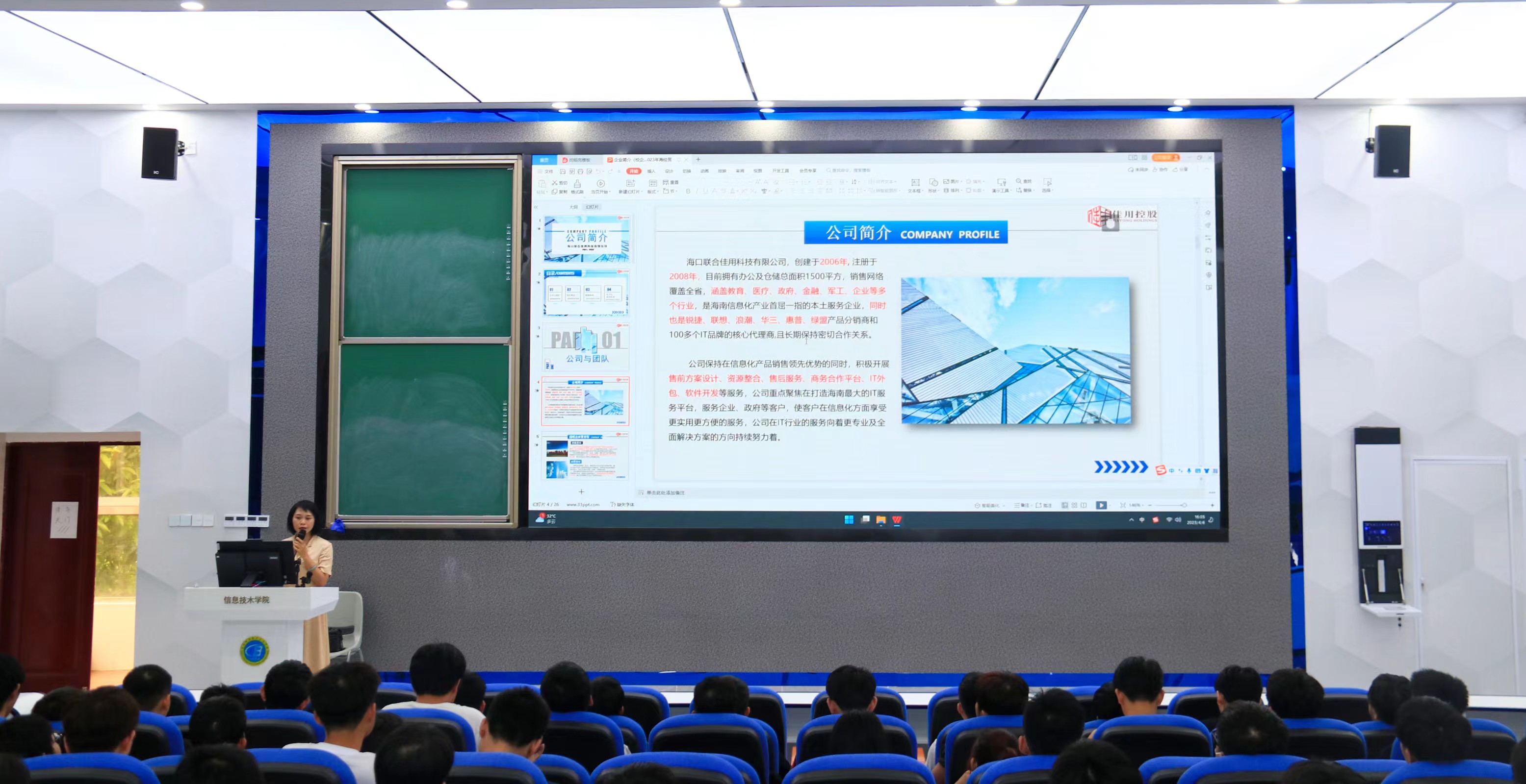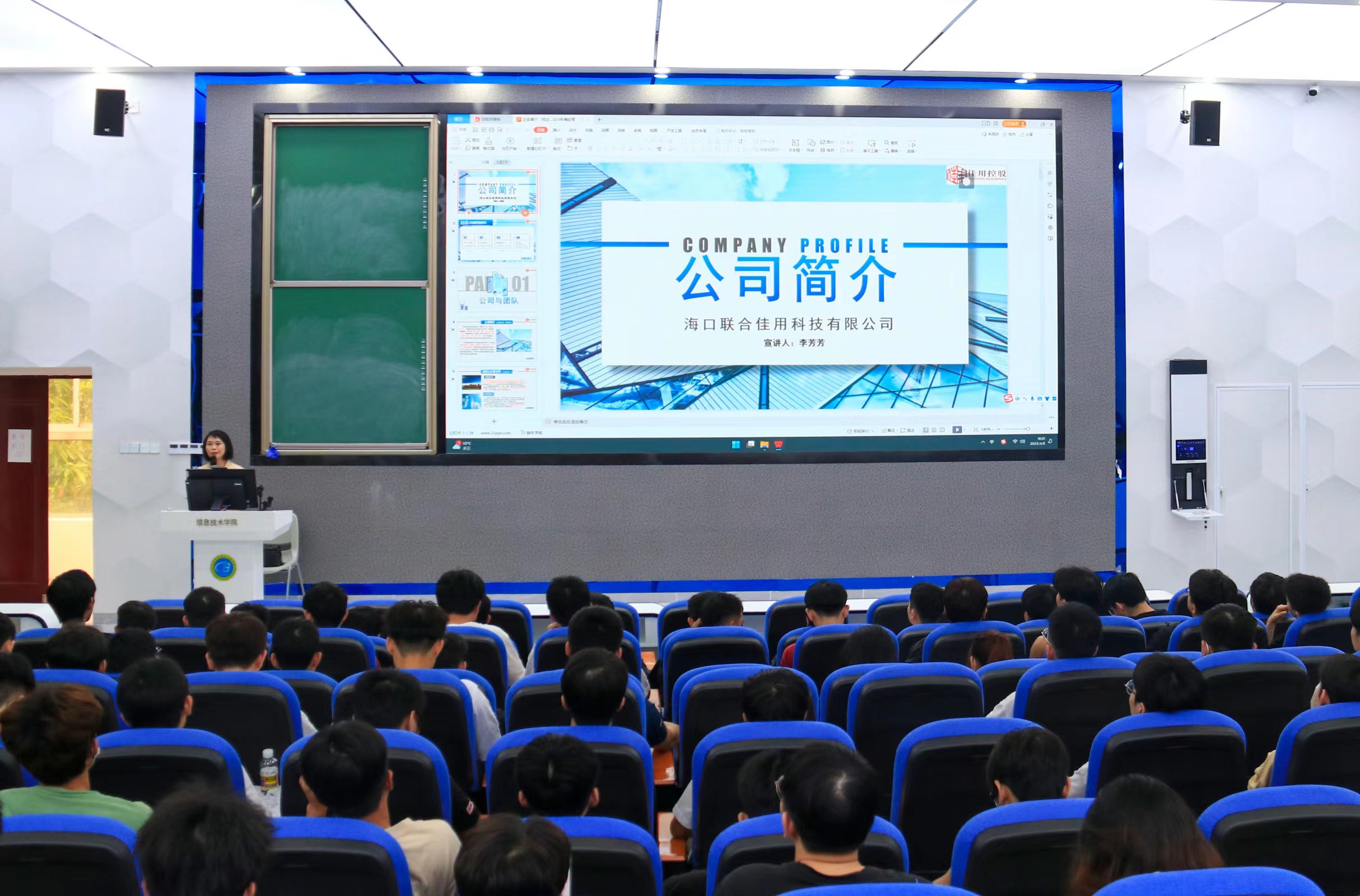 招聘会现场,海口联合佳用科技有限公司宣讲人李芳芳经理向在场的同学介绍了公司的战略与经营目标,并就岗位概况,薪资福利,售前培训,售后培训,晋升通道,办公环境,公司结构进行了全面地讲解。在交流互动环节中,宣讲人与在场的毕业生进行了深入的交流,为同学们答疑解惑,了解了大家的就业意愿,现场氛围良好。