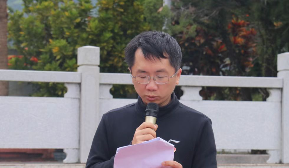 教师党支部委员林阳以纪念碑为实景背景,带领师生党员重温朱德同志1957年的题诗,结合详实史料生动还原了六连岭革命根据地“二十三年红旗不倒”的壮丽斗争史诗。他重点讲述了革命志士以深山为巢、以岩洞为舍的艰苦坚守,以野菜充饥、持土枪御敌的顽强抗争,通过一个个鲜活的英雄事迹,深情回顾了先烈们在强敌环伺中守护革命火种的峥嵘历程,深刻阐释了“信念坚定、心系群众、艰苦卓绝、英勇奉献”的六连岭红色精神核心要义。他还强调,六连岭革命历史是党史学习教育的生动教材,英烈们用忠诚和担当书写的革命史诗,是激励我们前行的宝贵精神财富。