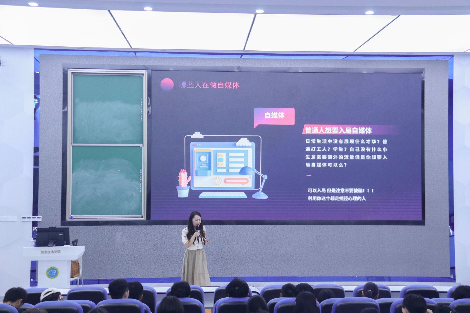 4月11日下午,“新媒体技术劳动工坊第四期公益讲座”在4-215成功举办。本次讲座以“自媒体入门白皮书”为主题展开,由海南英立大数据服务有限公司项目经理王倩老师担任主讲人,来自全校各个专业共计220余名同学共同聆听了此次讲座。