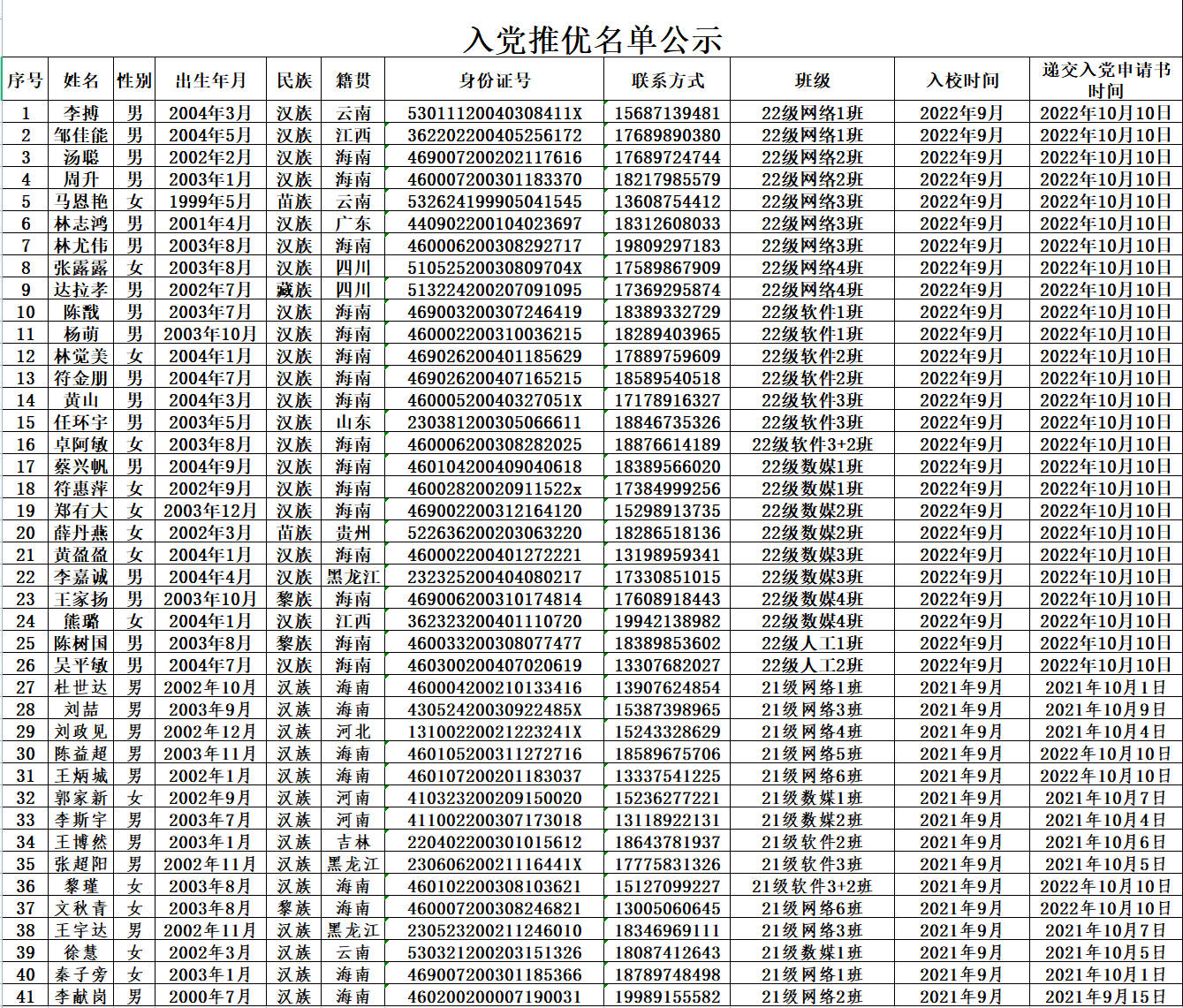 根据《进一步规范和加强公司推荐优秀共青团员入党工作的通知》、《中共中央组织部、共青团中央委员会关于进一步做好推荐优秀团员作党的发展对象工作的意见》、《中共中央组织部关于进一步加强在青年中发展党员工作的意见》、《中共中央组织部、中共中央宣传部、中共教育部党组关于进一步加强高校员工党员发展和教育管理服务工作的若干意见》、《共青团推优入党工作实施办法(试行)》等文件要求,并结合《BEVITOR伟德关于推荐优秀团员作为党的发展对象工作实施办法》的文件精神。经各团支部民主推荐,二级公司团总支审查,校团委审核并公示。2022年11月推优入党名单如下:(41人)