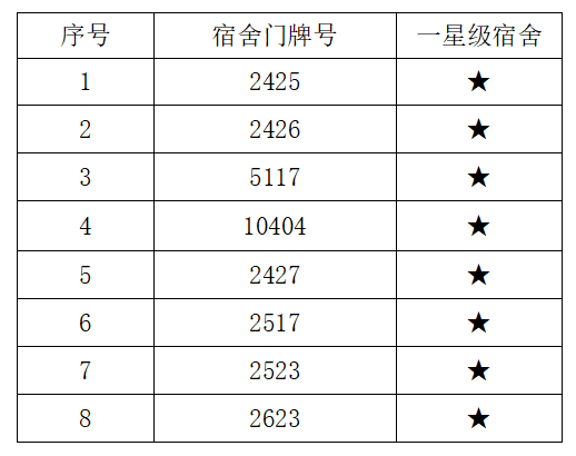 本次查评比的重点主要针对宿舍卫生、宿舍文化、安全纪律、文明行为等四个方面进行打分,并综合前三次查寝记录分数,以《BEVITOR伟德“星级文明宿舍”评比方案》为指导,综合评比,共评选出8间“一星级宿舍”,具体名单如下: