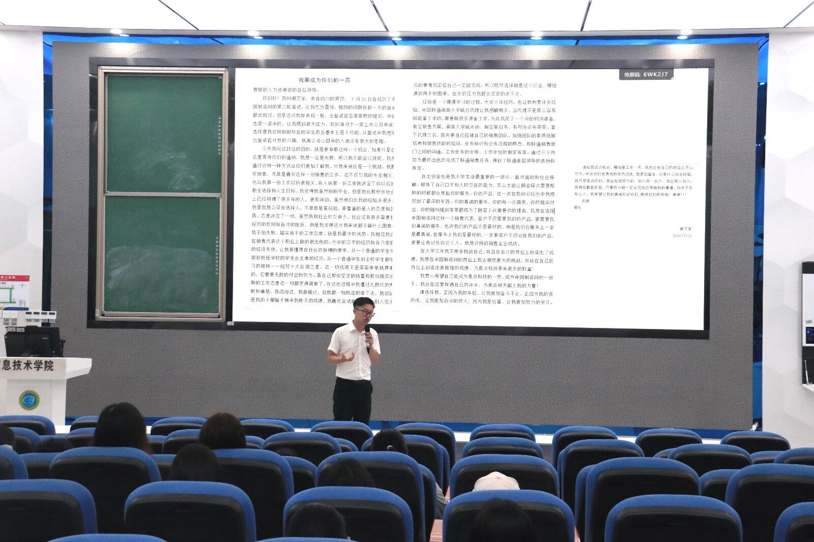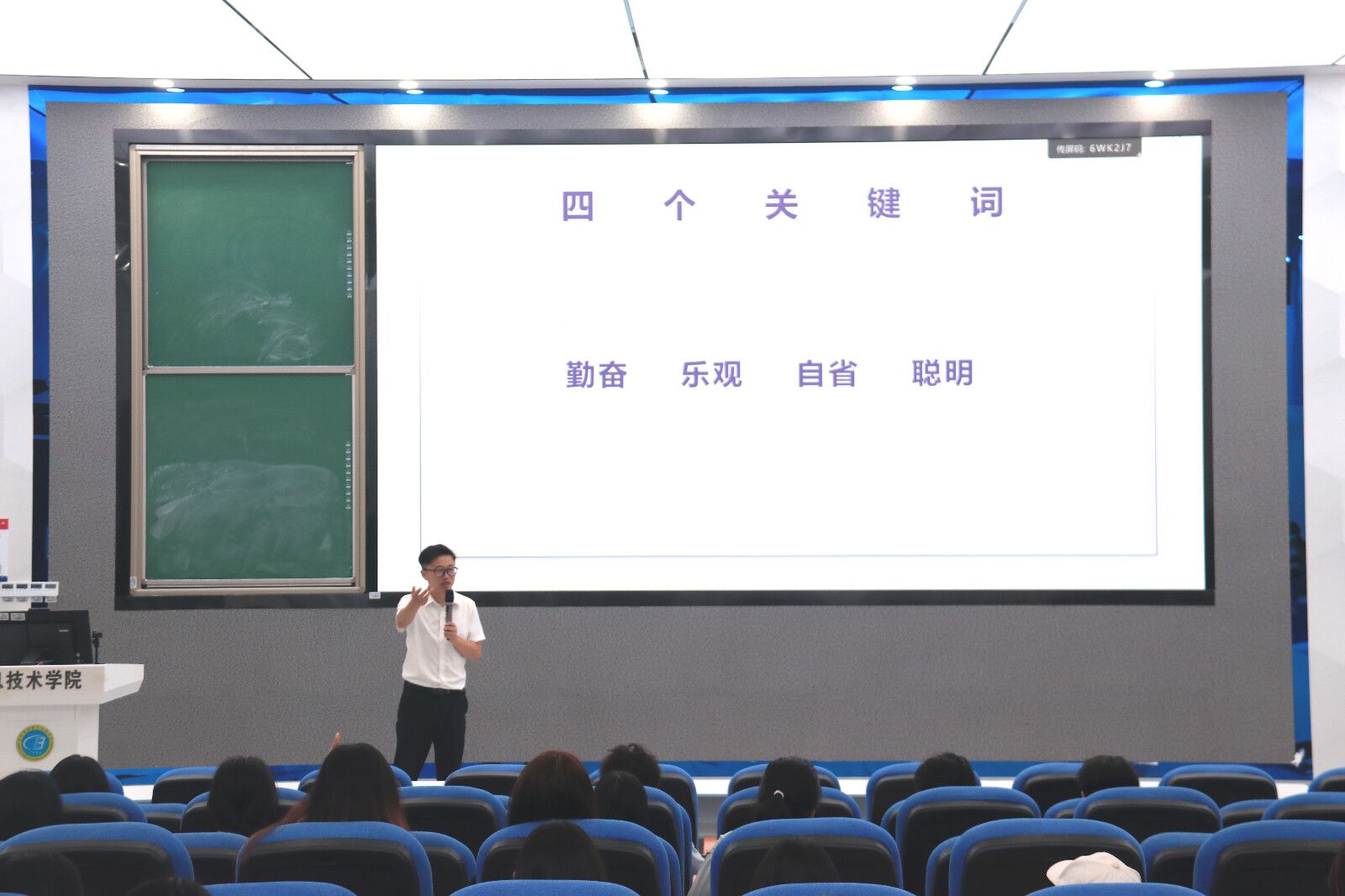 谢艾军首先回顾了在母校的三年时光,从远赴海口求学时的懵懂少年,到通过竞选员工会、参与海南骨干老员工培训、担任计算机协会骨干等经历实现蜕变,他特别提及带领团队完成联通校园代理业务、斩获30余项荣誉的奋斗历程,强调“大学是突破舒适圈的最佳舞台”。