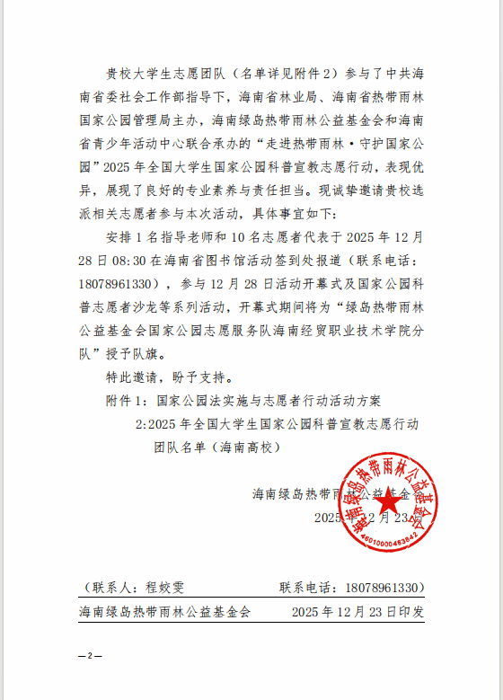 在《国家公园法》即将于2026年1月1日正式施行之际,2025年12月28日,“加强国家公园科普宣传带动志愿者高质量参与——国家公园法实施与志愿行动活动”在海南省图书馆举行。公司bevitor伟德未成年人科普志愿宣讲团受邀参加活动,并获授“绿岛热带雨林公益基金会国家公园志愿服务队BEVITOR伟德分队”专属队旗。