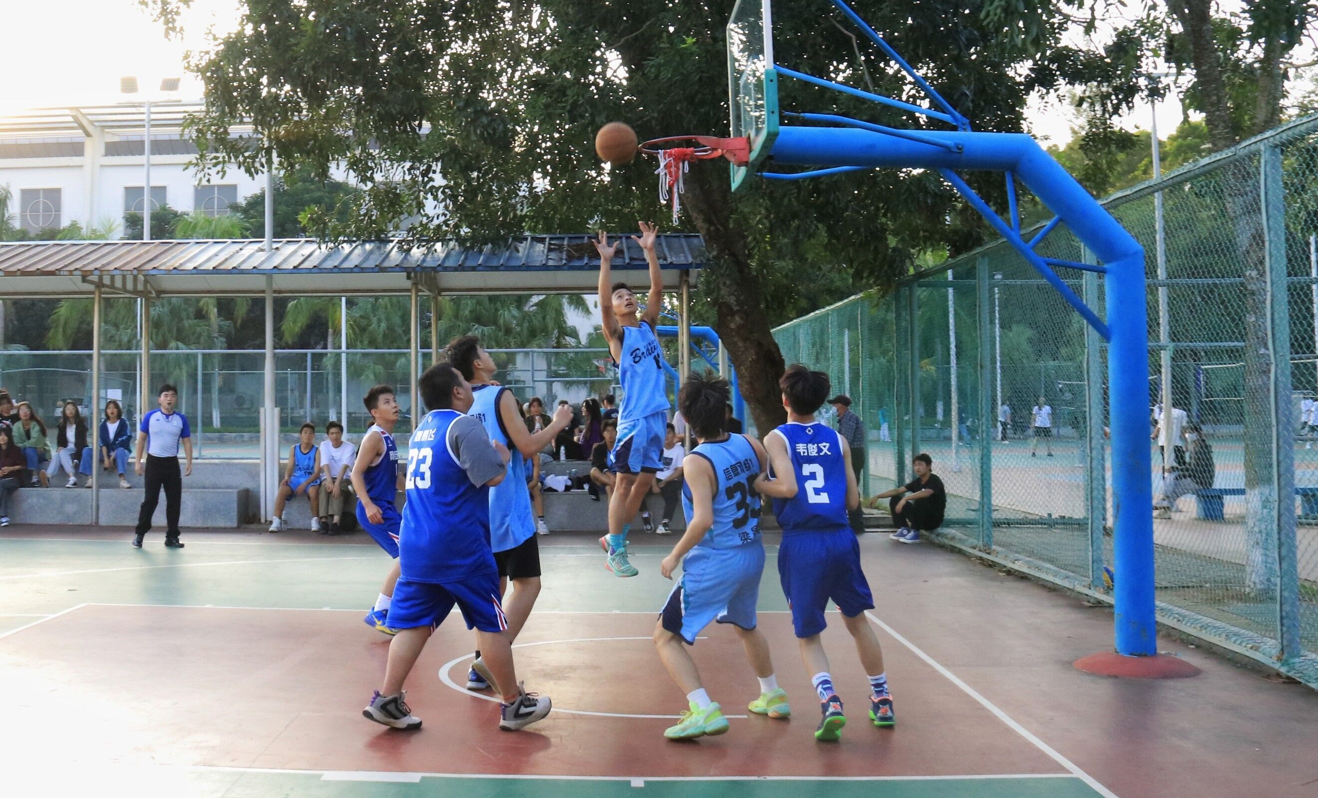 比赛开始,队员们迅速投入状态,神情认真,动作形如流水,双方都在尽力防守,只为力挽狂澜。队员们在场上奋力拼搏,挥洒汗水,同学们在场下加油欢呼,每进一球,队员和观看同学都激动不已。队员们在球场上比拼,场下同学为双方队员呼喊,声音震耳欲聋,似乎台下也在相互较劲,激烈而又热闹。