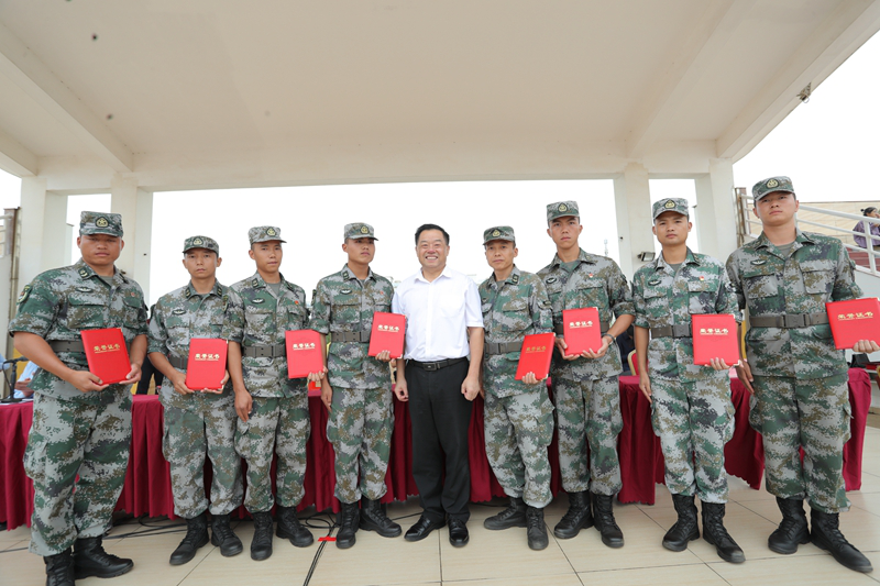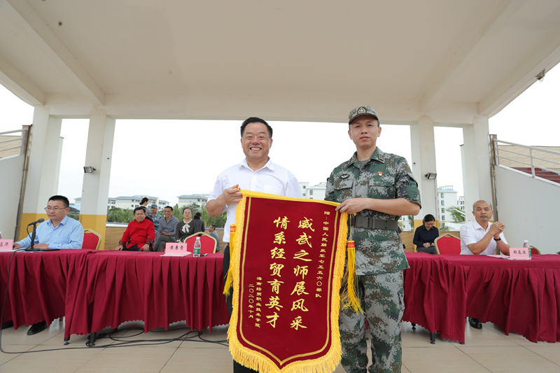 黄景贵经理代表公司向承训部队赠送“威武之师展风采、情系经贸育英才”锦旗,感谢教官们给予公司新生的军训帮扶,并为17位教官颁发“优秀教官”奖。