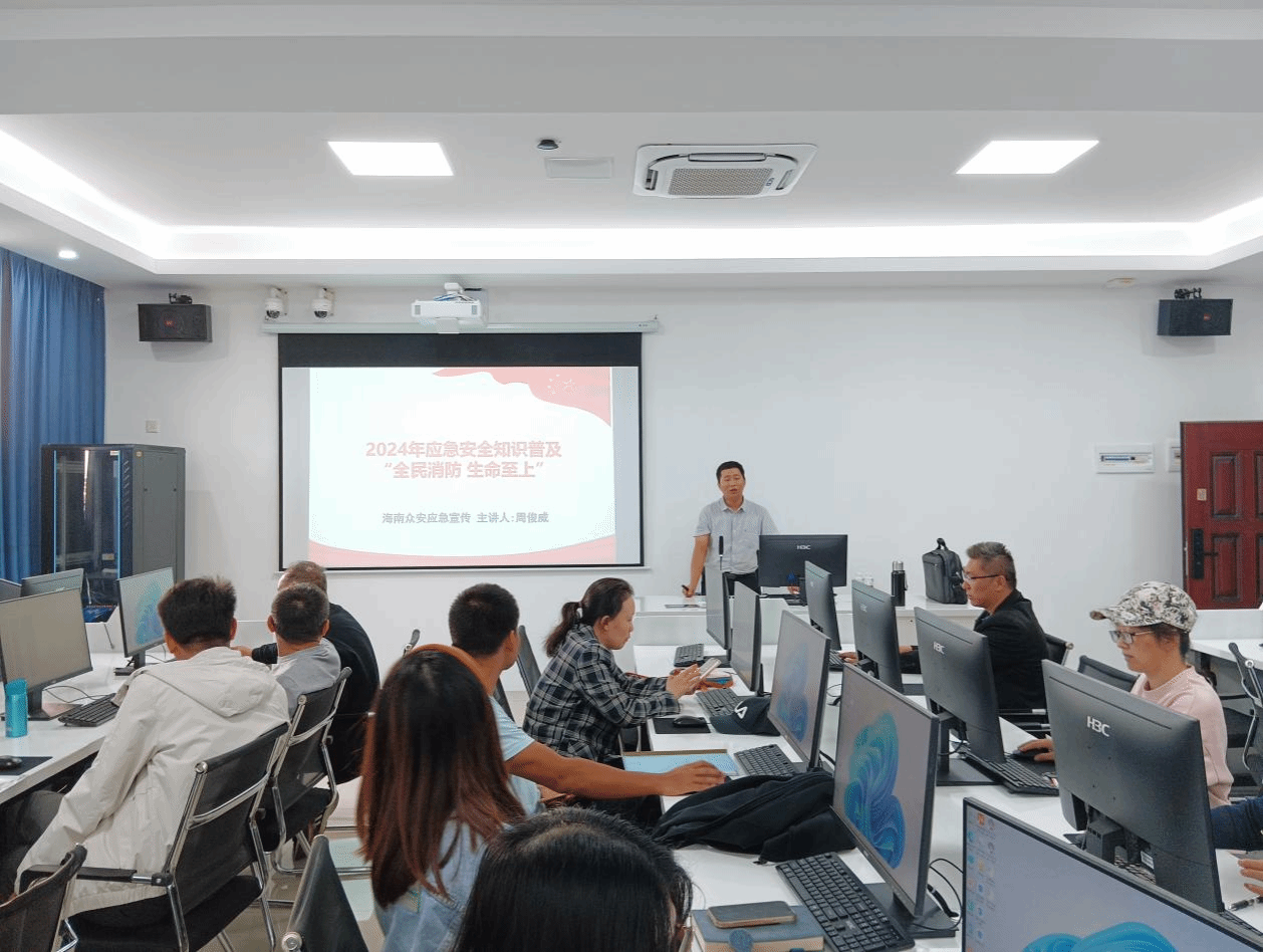 应急宣传教员周俊威讲解了各类灭火器、防毒面具的使用及操作方法,用多媒体视频和图文的形式向大家介绍了常见的家庭起火、交通工具起火、办公室起火的原因及造成的危害,并结合海南省近期发生的火灾案例,对师生进行警示教育。