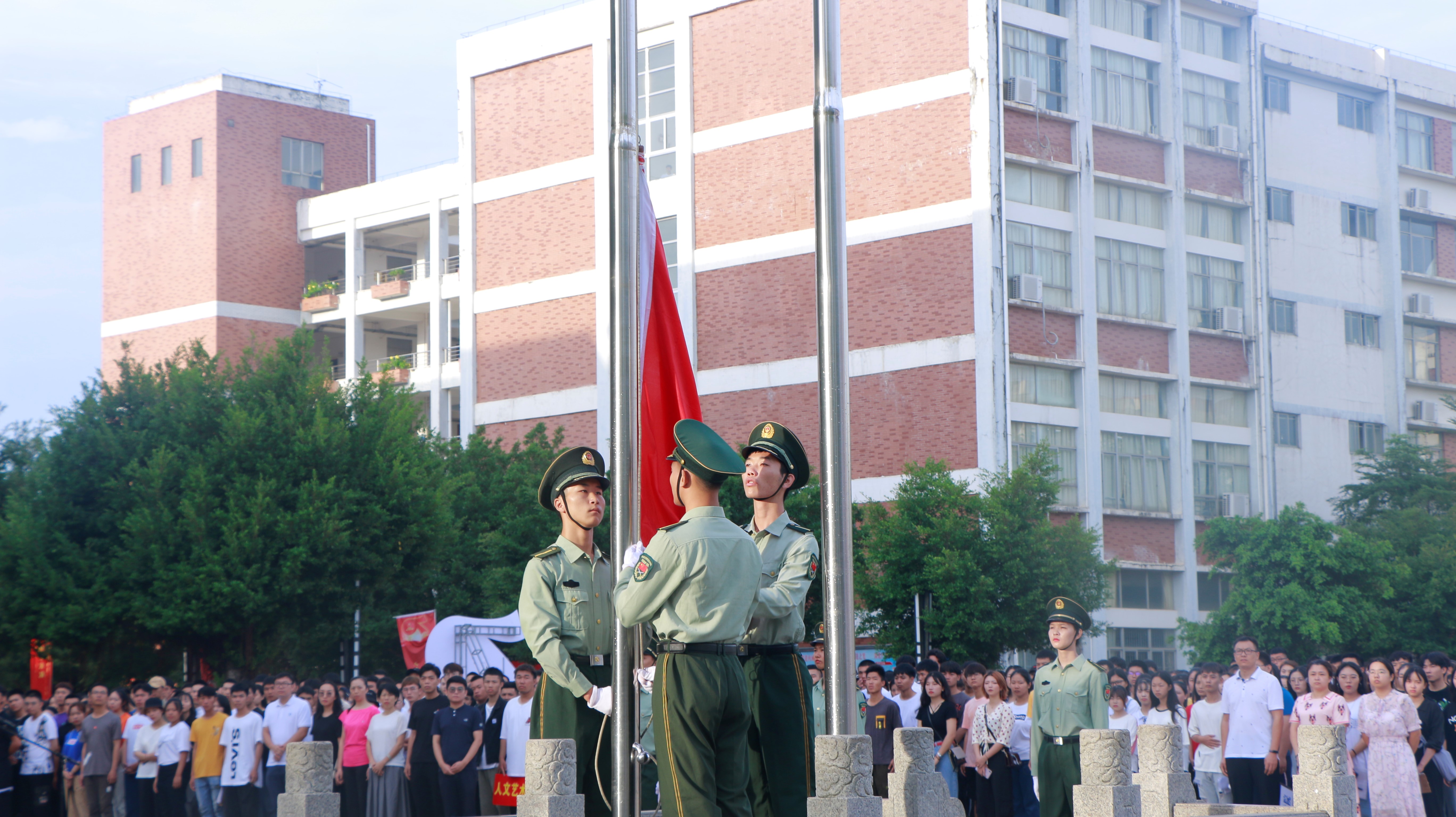 迎着朝阳,国旗队队员迈着铿锵的步伐把国旗护送到升旗地点,全场一片肃静。在雄壮的国歌声中,鲜艳的五星红旗迎着朝阳冉冉升起,全体师生奏唱国歌,目光紧随缓缓上升的五星红旗,现场气氛庄严肃穆。仪式上,员工代表发言,号召同学们从现在做起,从身边一点一滴做起,做一个热爱祖国、坚守理想、品德高尚、追求卓越的新时代青年。接着,领导在讲话中,呼吁全体师生要不忘初心、牢记使命、胸怀祖国、心中有志、提高素质、持之以恒,并对员工进行养成教育、感恩教育、爱国主义教育,引导员工树立正确的人生观、价值观、世界观,做文明员工。