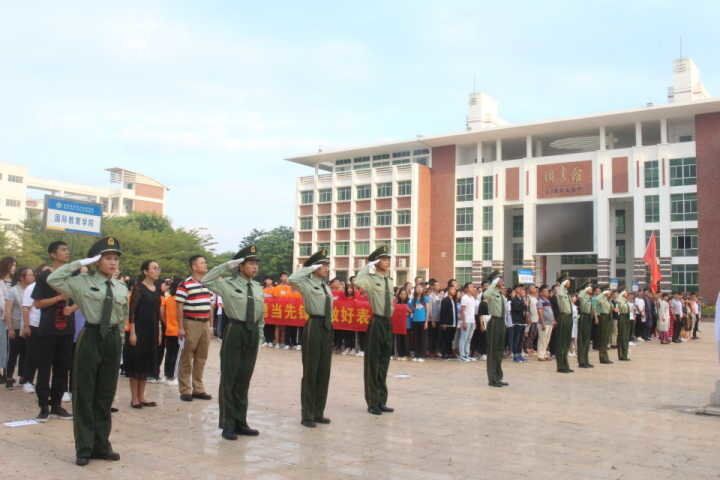 升旗仪式上,国旗护卫队的同学迎着朝阳,迈着矫健有力的步伐,护送鲜艳的五星红旗庄严入场,在雄浑嘹亮的国歌声中,五星红旗冉冉升起,全体师生齐行注目礼,庄严肃穆。