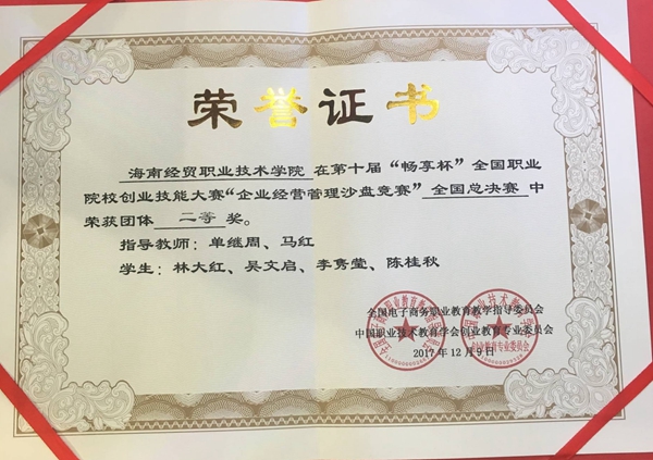 工程技术公司贯彻落实创新创业发展理念,全面推进职业教育内涵式发展,以员工为主导,提高员工在训练过程中发现问题、解决问题的能力,较好地锻炼与提升员工自主创业及管理企业能力,为员工今后的自主创业奠定坚实基础。在指导教师单继周、马红的耐心指导下,工程技术公司四名员工经过二个多月的赛前刻苦训练,凭借扎实的知识和良好的团队合作精神,表现突出,荣获比赛团体二等奖,充分展现了海经贸学子的风采。