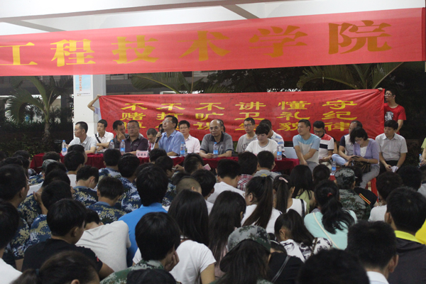 接下来,由陈继敏书记对员工到校承诺以及军训期间具体安排进行了详细说明。书记通过讲一些历史事件让同学们懂得纪律的重要性,明白没有铁的纪律,就没有钢的成就。针对公司工科员工的特点,特地制定了新生纪律制度,守纪律、懂礼貌、讲卫生、不旷课、不打架、不赌博,让每个新生在横幅上签名,承诺自己一定会做到这几点。最后,会议以全体成员庄严宣誓画上了圆满的句号。