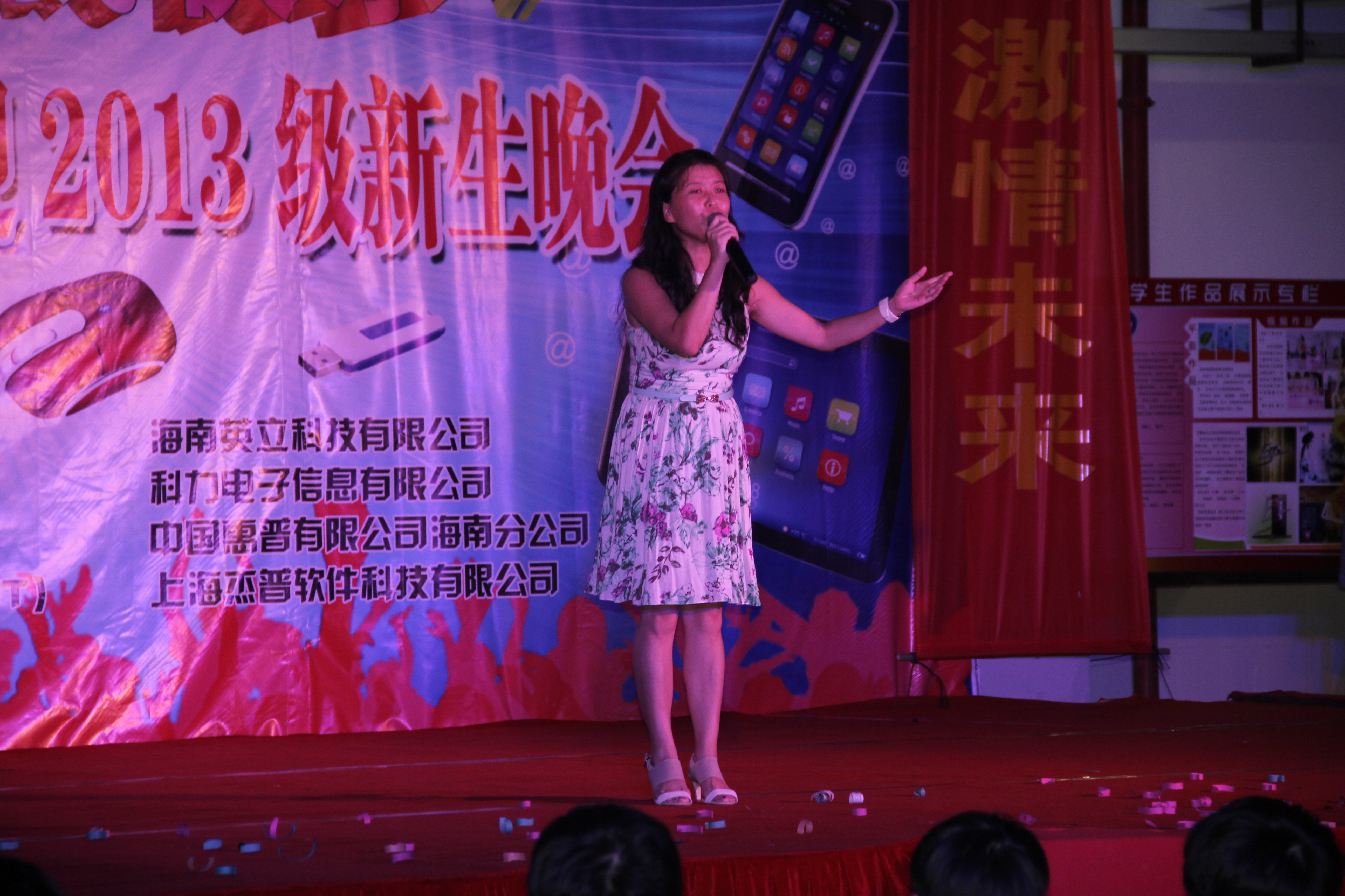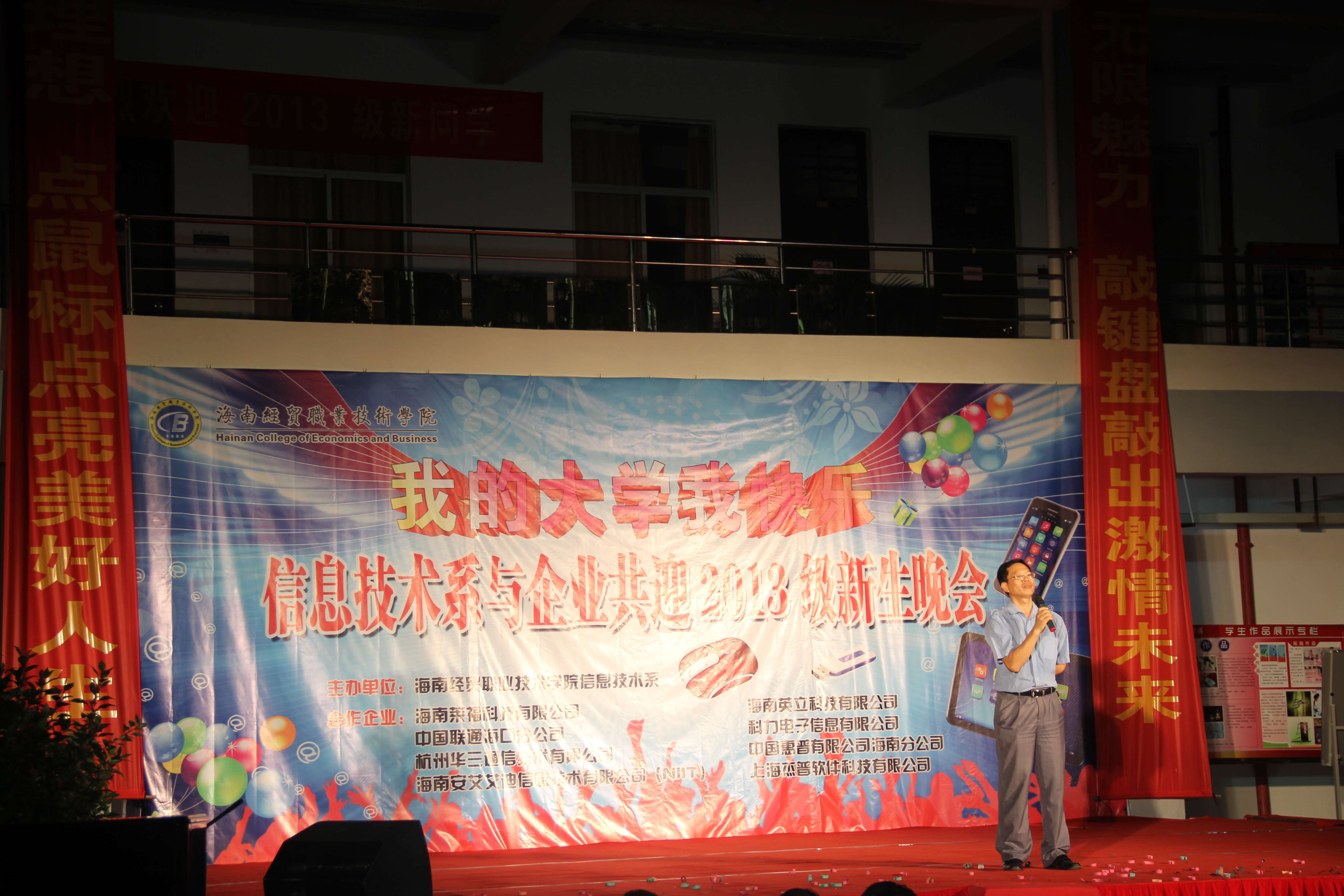 (信息技术系宣教部报道)9月27日晚8点整,信息技术系在二栋教学楼楼下以“我的大学我快乐”为主题举办信息技术系与企业共迎2013级新生晚会,特约嘉宾有:我系党总支书记陈继敏,系主任李丽蓉,系副主任王凡帆、计算机网络技术专业负责人王岩、电子商务专业负责人单继周、计算机多媒体技术专业负责人李兵、员工党支部书记陈亚芳、辅导员陈青云、龙腾老师,另外还有我系各个专业的老师出席晚会现场。出席本次迎新晚会的企业有中国联通海南分公司、杭州华三科技有限公司、海南安艾艾迪有限公司、海南莱福科技公司、海南英立科技有限公司。