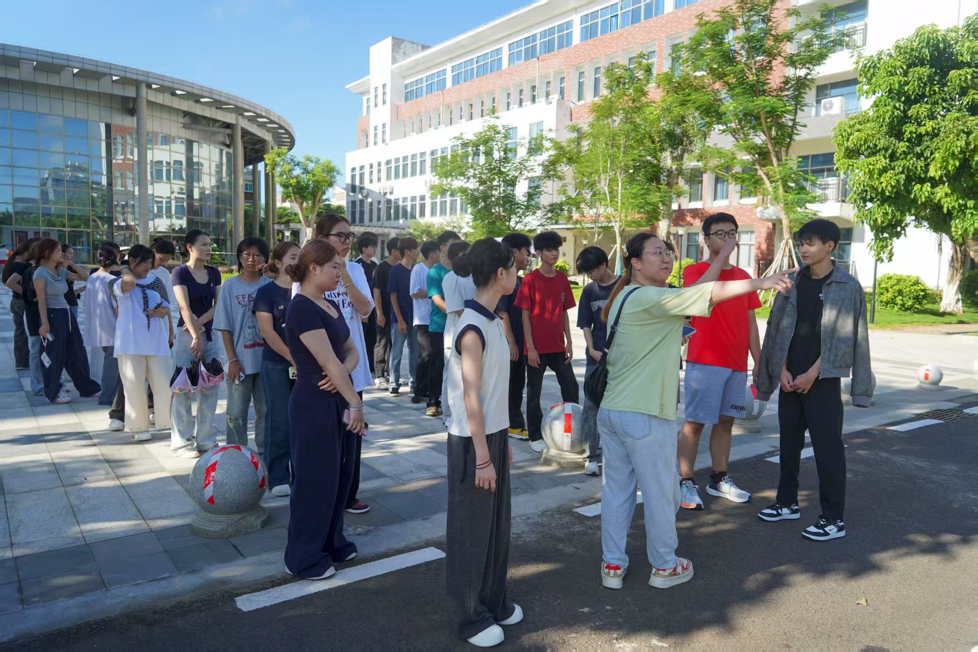 从四教出发,首站抵达的是呈对称分布的一教和二教,这里是思政、英语公共课的主阵地。代班对照指引标识帮新生熟悉位置,化解上课找楼的困扰。随后一行人先后前往三教、五教和六教,代班特别说明,三教、五教、六教主要供其他公司使用,若有跨公司活动,需提前规划路线,避免耽误时间。