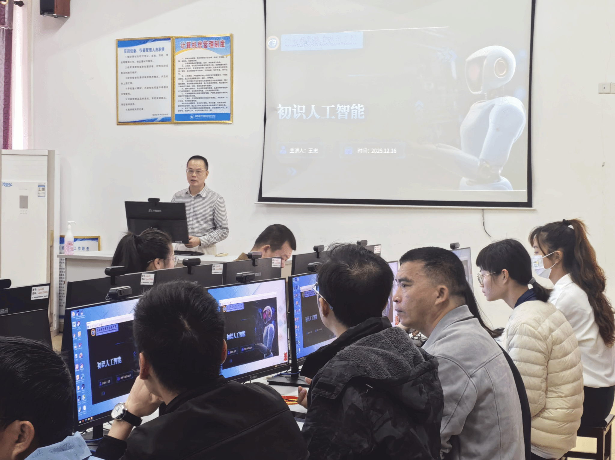 为深入贯彻落实省委人才办《关于开展2025年专家团队巡回帮扶活动的通知》要求,推动人工智能技术与职业公司产品深度融合,12月16日下午,应临高县中等职业技术公司邀请,公司人工智能领域专家王忠教授、康东副教授专程前往该校,开展了一场主题鲜明、内容扎实的AI教学能力提升培训。临高职校全体专业课教师及教学管理人员齐聚一堂,共同参与了此次学习。